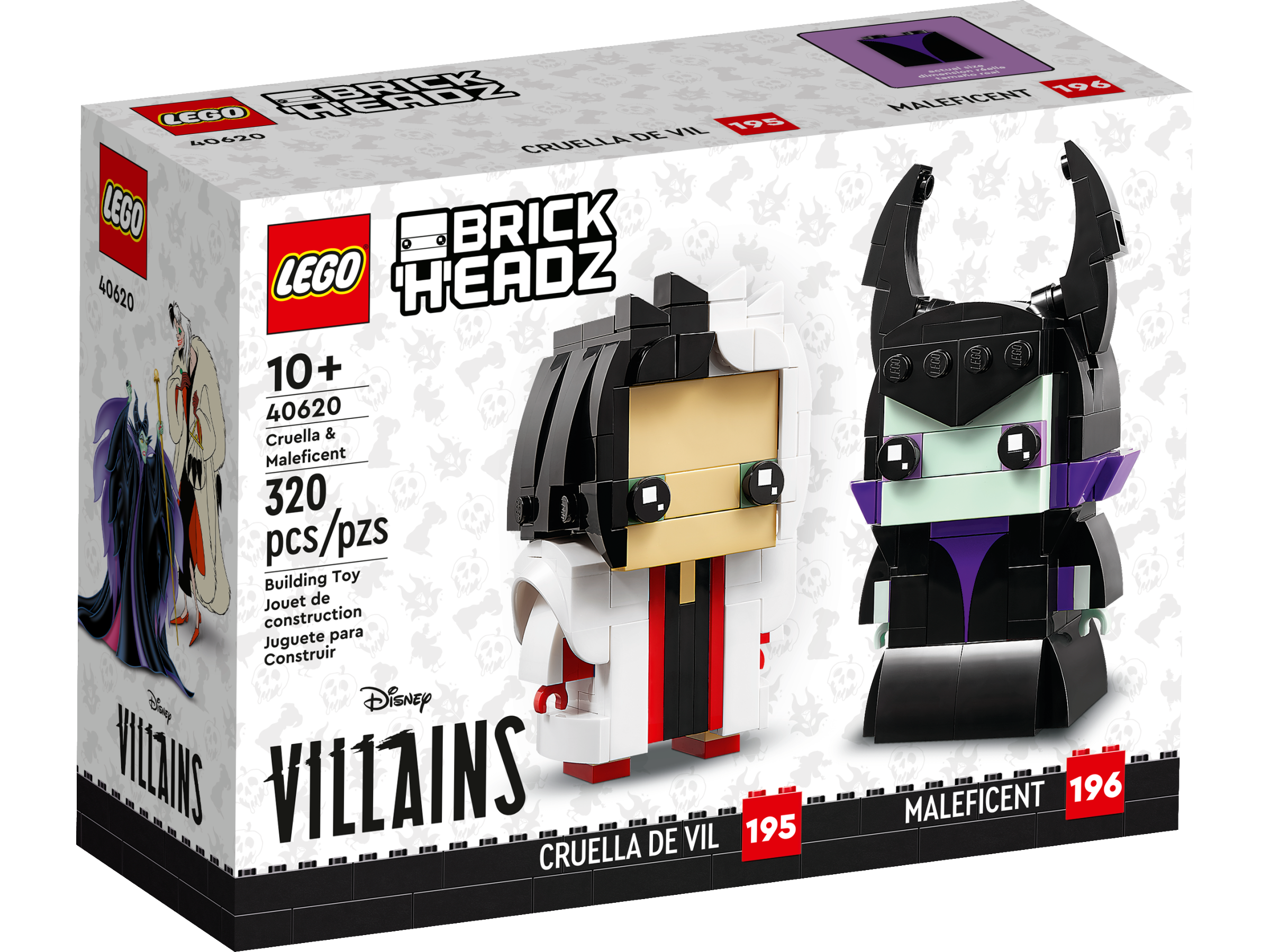 Thrill kids and movie fans aged 10+ with this BrickHeadz™ set featuring Disney’s iconic Cruella & Maleficent (40620) buildable LEGO® figures. Build each of the detailed models, then set them on their individual baseplates and display anywhere at home or in the office. The set consists of 320 pieces to create the 2 LEGO figures. Maleficent’s torso includes a decorated sticker. The set makes a collectible everyday gift and display piece for kids or fans of Disney’s Cruella and Maleficent movies.