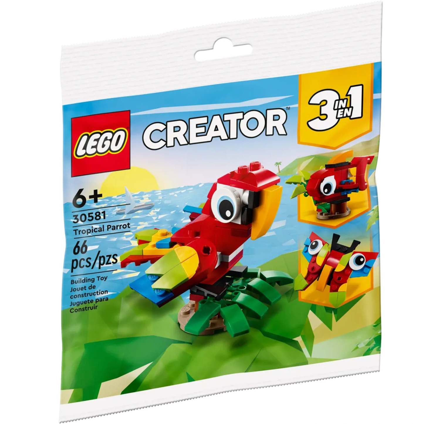 Animal fans will love creating this colorful Tropical Parrot. This LEGO® Creator 3in1 Tropical Parrot polybag (30581) can be rebuilt into a tropical butterfly with moving wings or a tropical fish on a display stand.