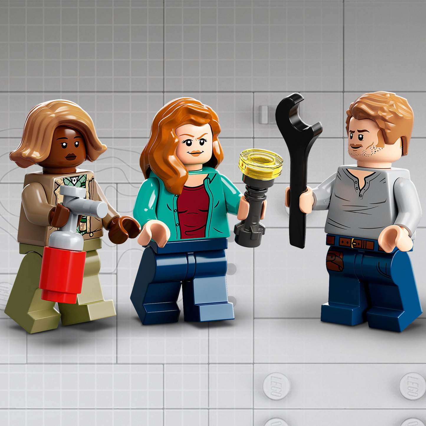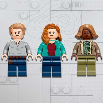 The set comes with step-by-step building instructions and includes Owen Grady, Claire Dearing and Kayla Watts minifigures, plus a buildable fire extinguisher and flashlight and wrench accessory elements to inspire imaginative storytelling.