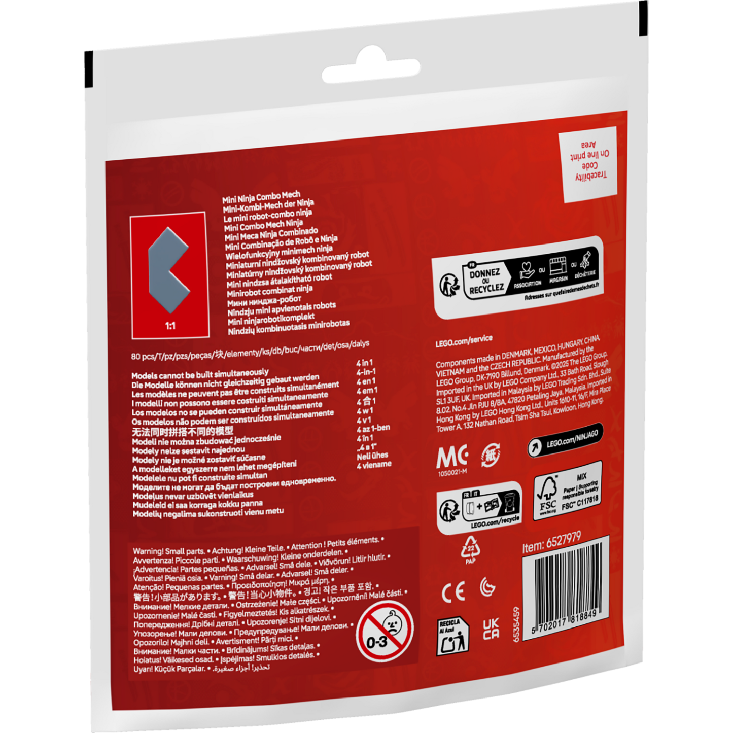 Mini version of Zane’s Ultra Combiner Mech (71834) lets kids build a posable mech figure with wings before rebuilding it into micro versions of Zane, Riyu, a jet and a car.