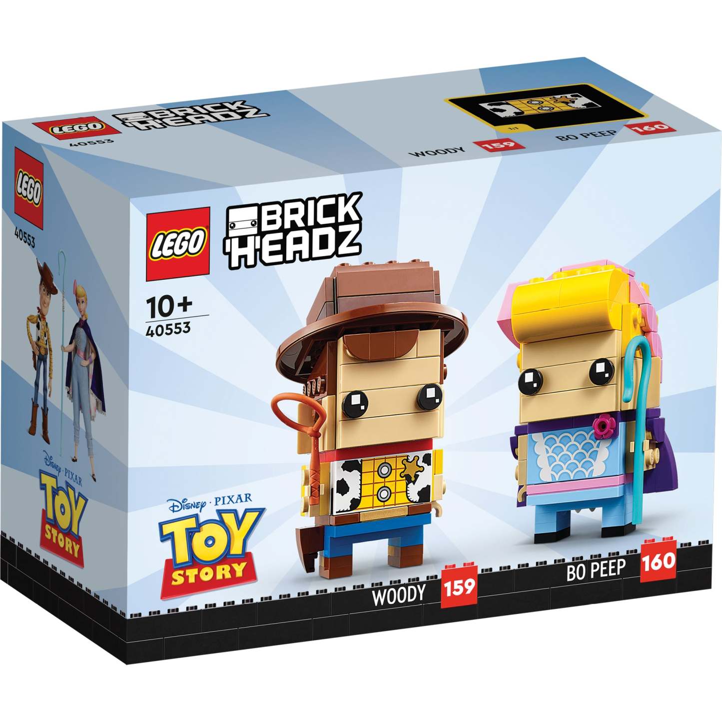- Disney characters in LEGO® BrickHeadz™ style – buildable LEGO BrickHeadz figures of Disney and Pixar’s Woody and Bo Peep (40553) in their iconic movie outfits, with well-known details