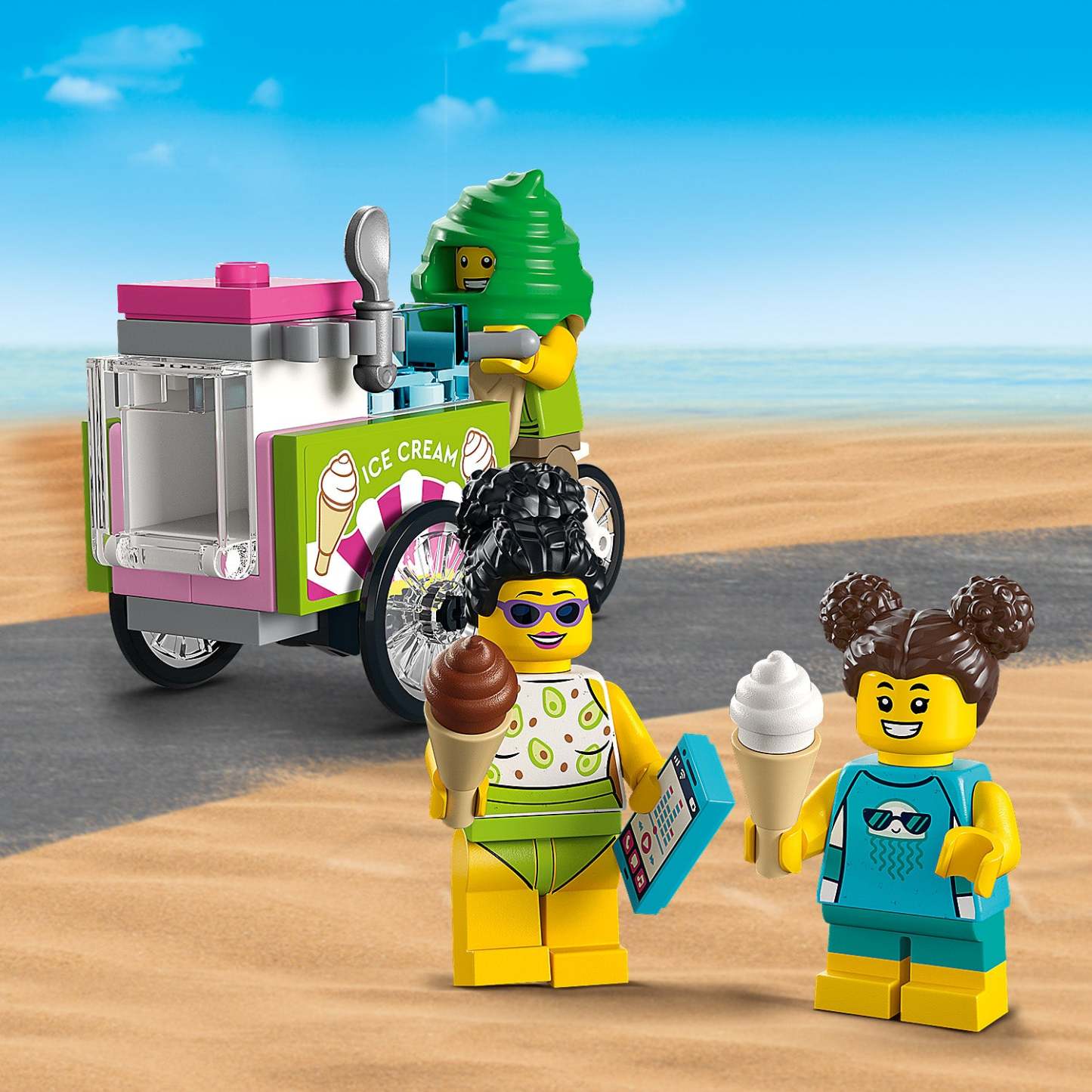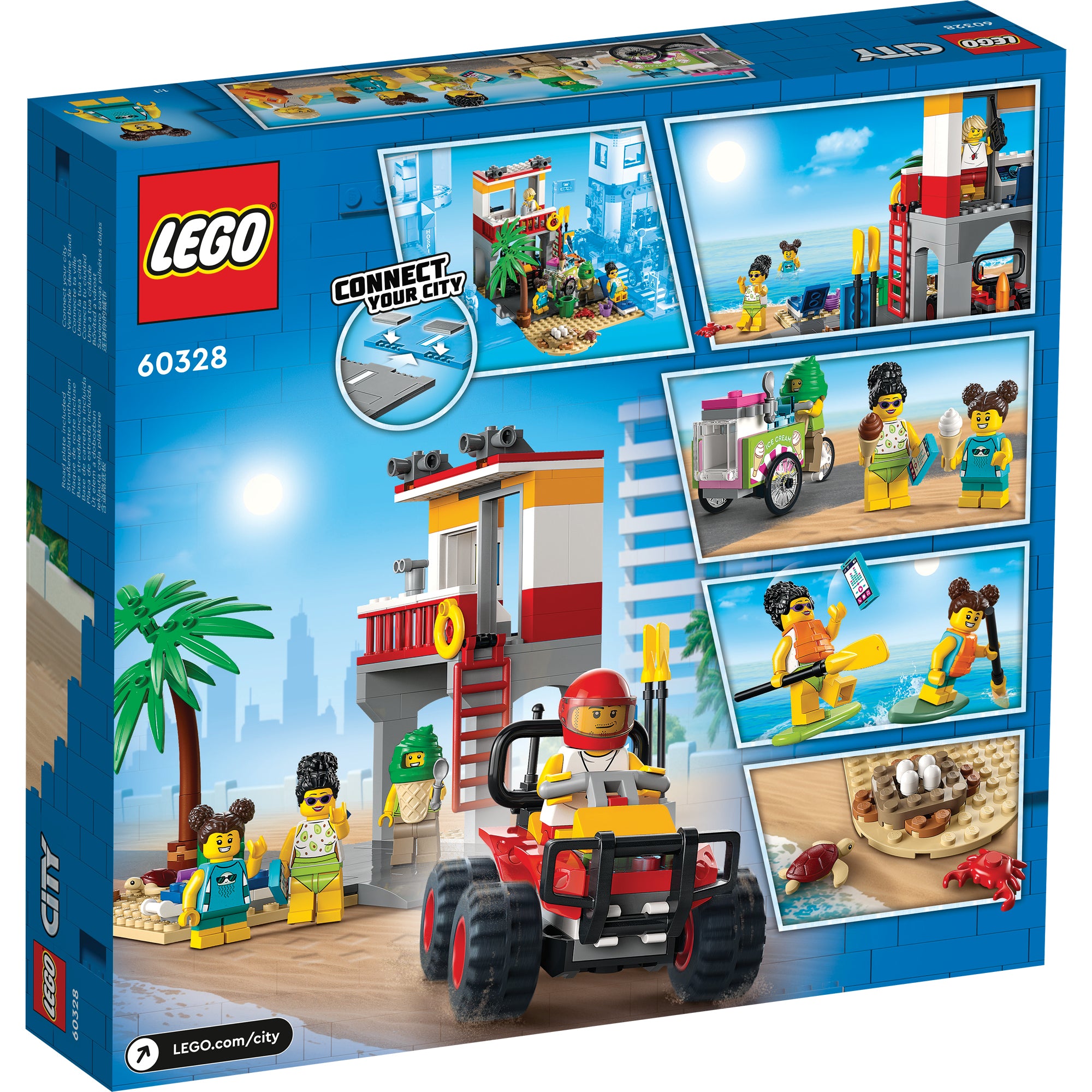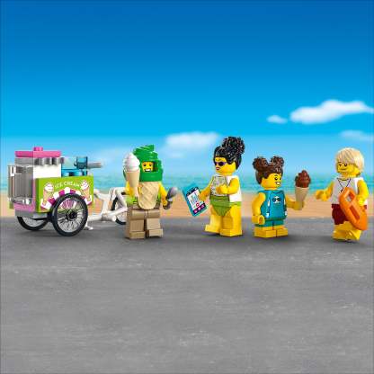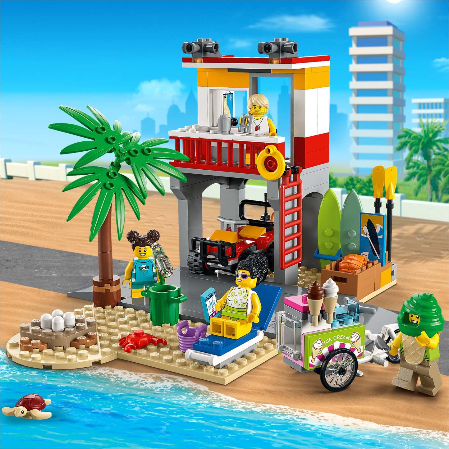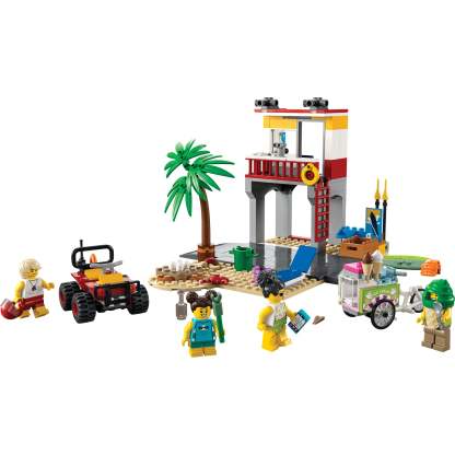- What’s in the box? – Everything kids need to build a 2-level Lifeguard Station, ATV, ice-cream cart and beach setting with a palm tree, plus 4 minifigures and crab and turtle figures