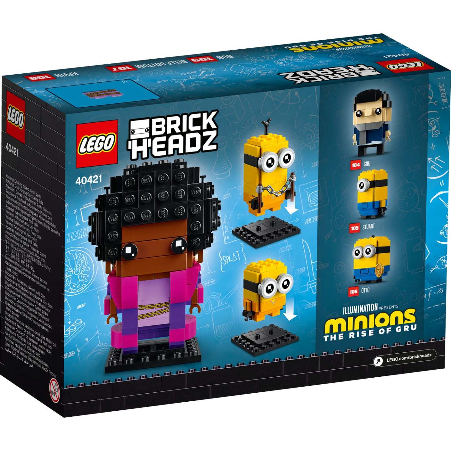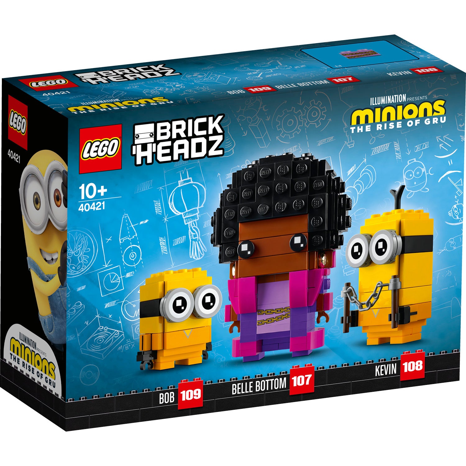 LEGO®BrickHeadz™ Belle Bottom, Kevin and Bob (40421) features 3 characters from the Minions movie: Belle Bottom, Minion Kevin and Minion Bob with a weapon. Like all models from the LEGO BrickHeadz collection, these 3 each come with a unique character ID and a sturdy baseplate for easy display, whether individually, as a group or alongside other BrickHeadz models.