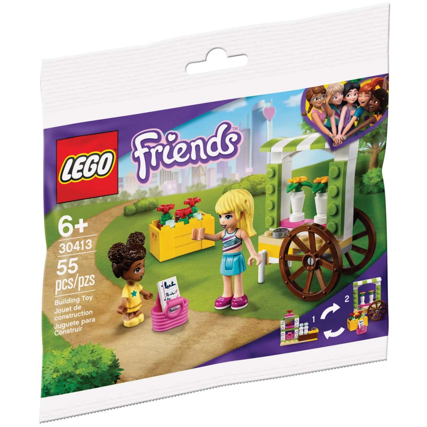 A colourful toy shopping cart gift for kids with LEGO® Friends Stephanie and Liz. The flowers in this polybag are buildable so kids can customize their wares or pretend to buy the blooms.