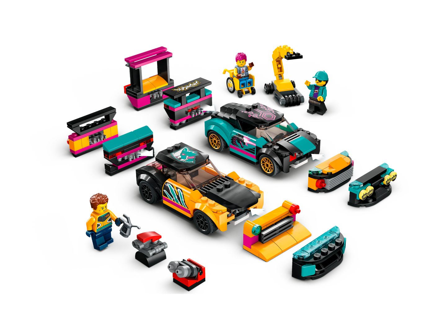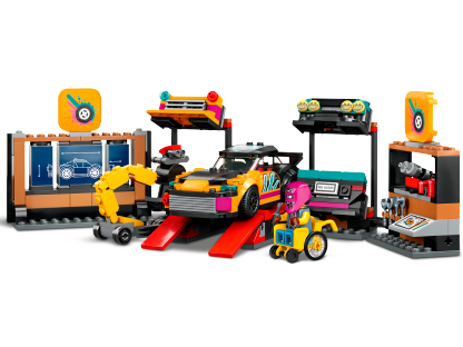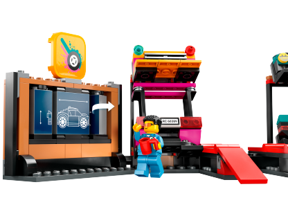 - What's in the box? – All kids need to create a custom car workshop with a configuration wall, ramps, engine hoist and 2 customizable cars, plus 2 mechanic and 2 driver minifigures