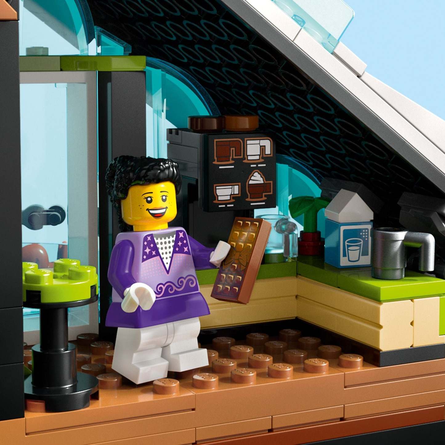 - What’s in the box? – Everything kids need to build a modular 3-level building with a winter sports shop, café and piste, plus 8 minifigures with ski accessories and snowman, owl and squirrel figures