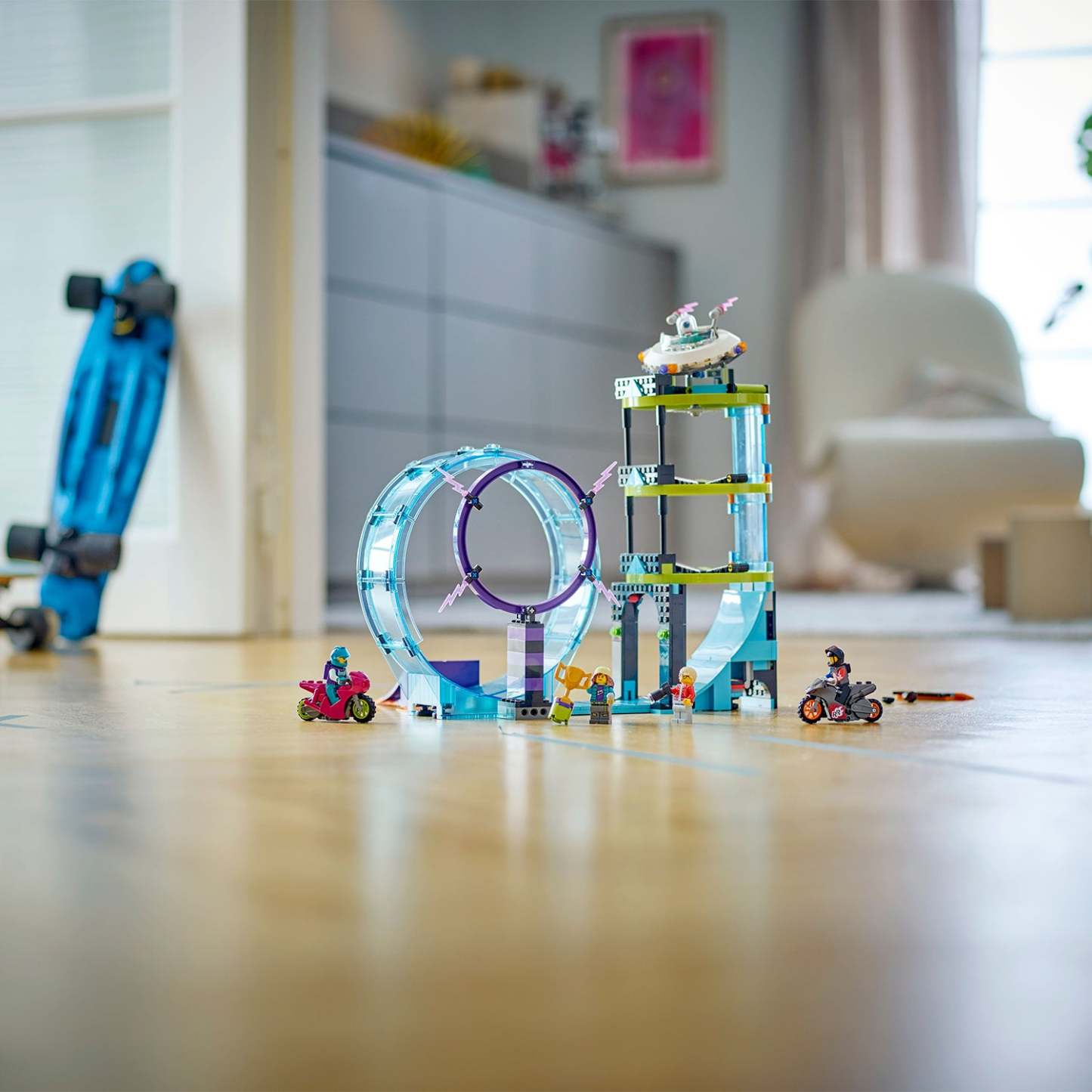 - What’s in the box? – Stunt challenges in this toy playset include a 360° loop, ring of fire and an ‘alien tower’ vertical climb, plus a jump ramp, 2 toy stunt motorcycles and 2 rider minifigures