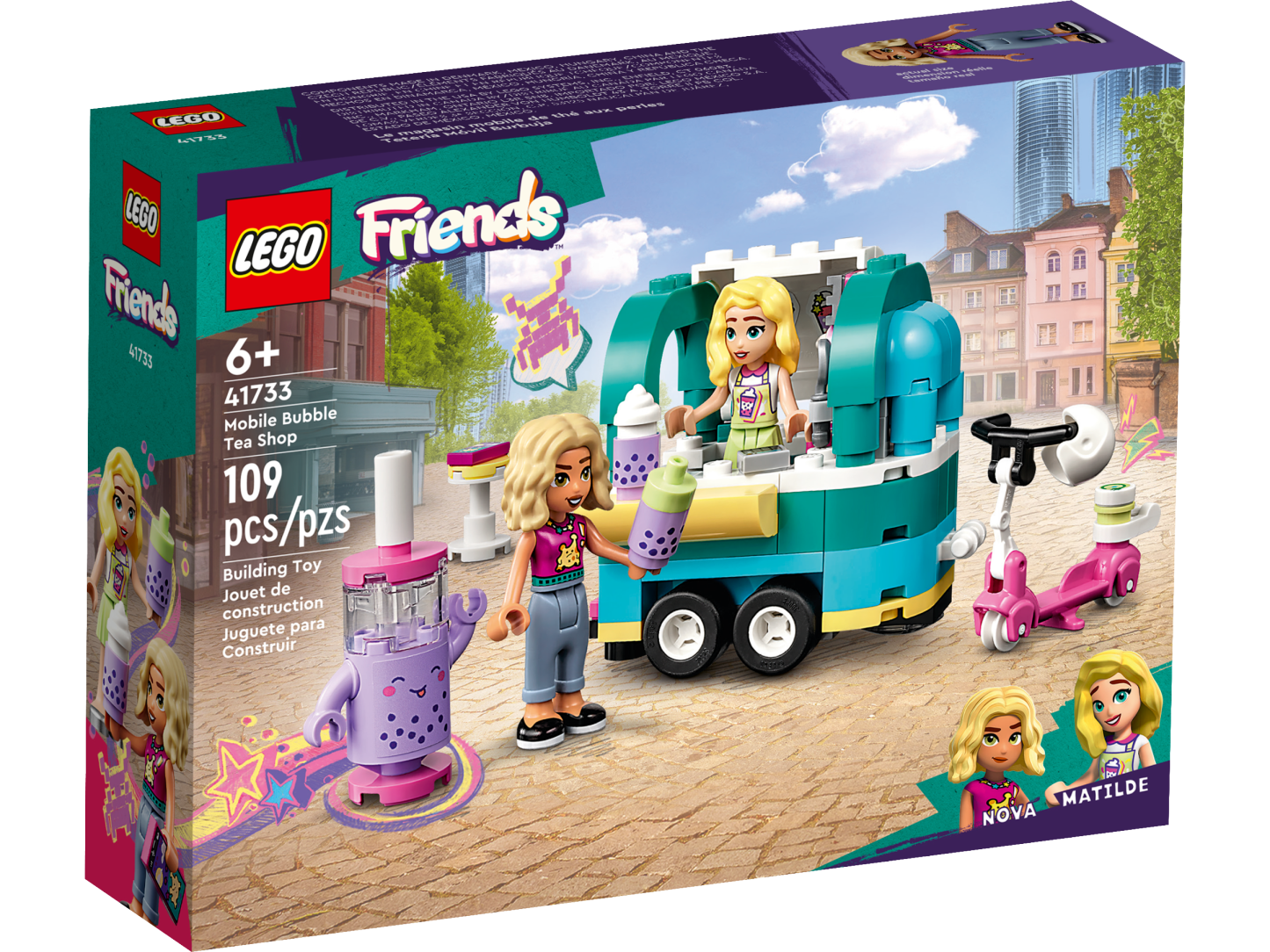 - 2 mini-dolls and accessories – The set comes with LEGO® Friends characters Nova and Matilde, whipped cream, 2 bubble tea bottles, a cash register and table, plus a mascot with a menu card