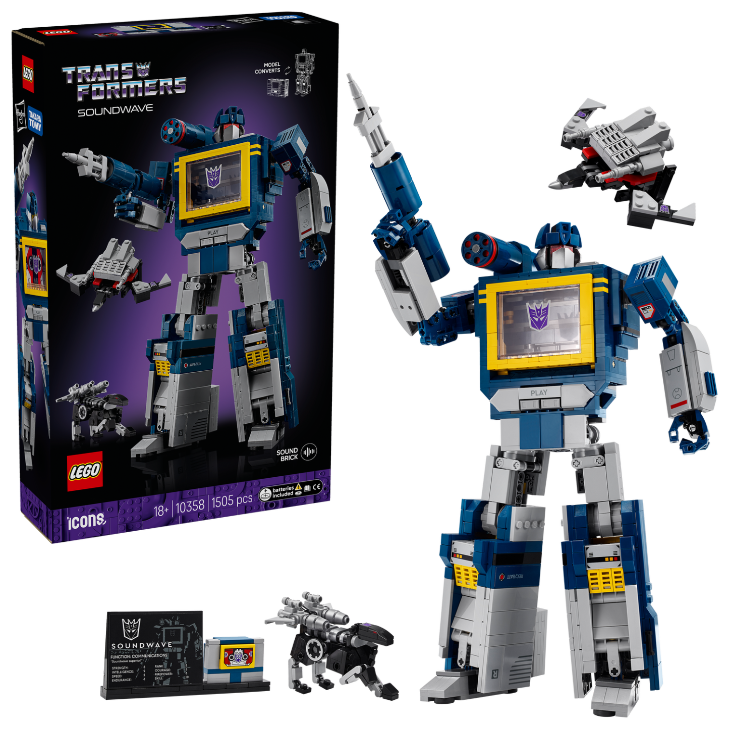 - What’s in the box? – Everything you need to craft a detailed LEGO® Icons Transformers: Soundwave figure with rocket pod, laser blaster and dart accessories, plus Ravage and Laserbeak figures