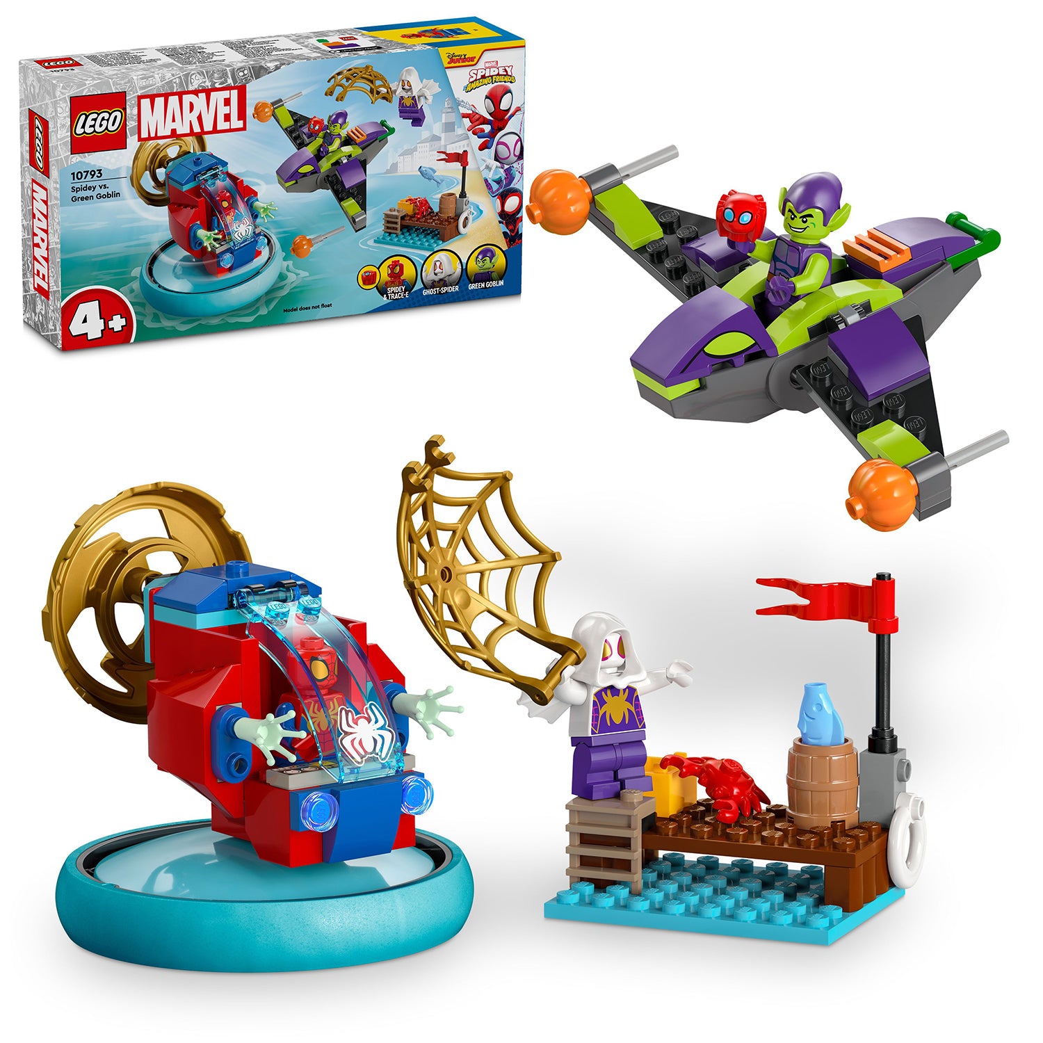 This Disney+ Spidey and His Amazing Friends toy vehicle set includes: a Spidey minifigure and his hover spinner with rotating propeller and lift-up cockpit; a Green Goblin minifigure and his glider with pumpkin projectiles; and a Ghost-Spider minifigure with her large, golden web element. There’s also Spidey’s robot friend Trace-E, sea accessories and a cute crab. The set comes with a cockpit Starter Brick to help get building underway and intuitive instructions in the form of a colourful picture-story guide.
