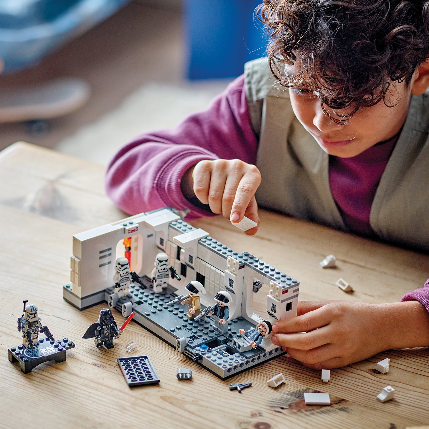- 7 LEGO® Star Wars™ minifigures – Darth Vader, 2 Stormtroopers, 2 Rebel Fleet Troopers and Captain Antilles, plus a LEGO Star Wars 25th anniversary minifigure of ARC Trooper Fives with a display stand