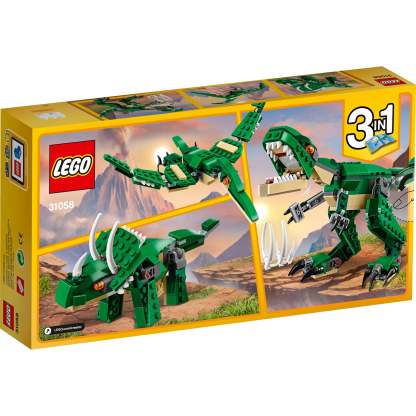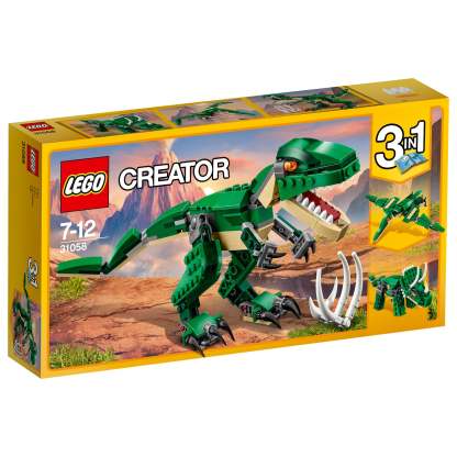 Have fun with the awesome T. rex, featuring a dark-green and beige color scheme, bright orange eyes, posable joints and head, large claws and an opening mouth with pointed teeth. Also includes the dinosaur’s prey in the form of a buildable rib cage. Rebuild this 3-in-1 LEGO® Creator Mighty Dinosaurs model to create a Triceratops or a Pterodactyl.