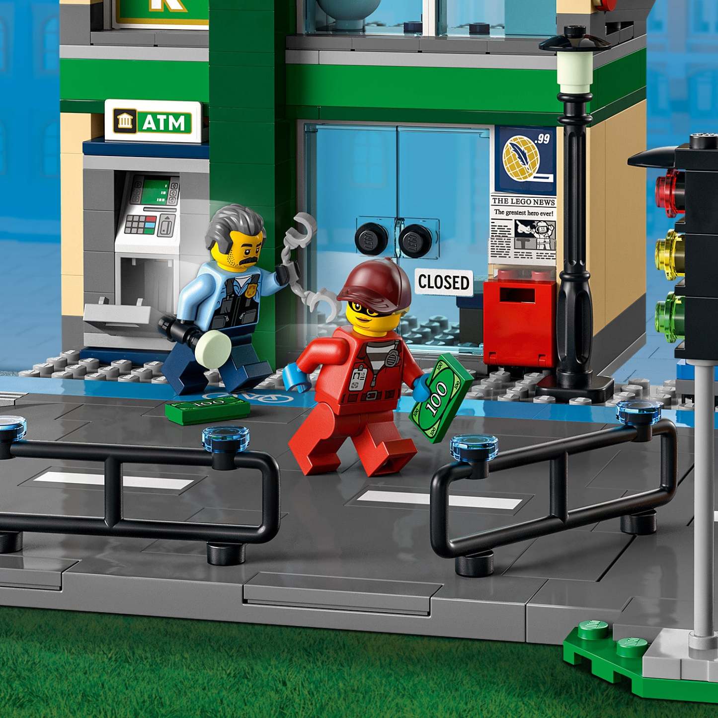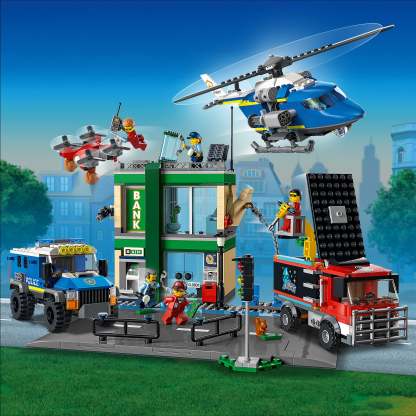 - What’s in the box? – Everything kids need to build a multifunctional bank building, crooks’ heist truck, police helicopter and police truck, plus 6 minifigures, including 5 LEGO® City TV characters