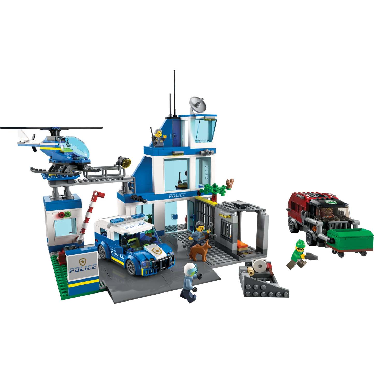 - What’s in the box? – Everything kids need to build a 3-level police station, patrol vehicle, helicopter and garbage truck, plus a dog figure and 5 minifigures, including 3 LEGO® City TV characters