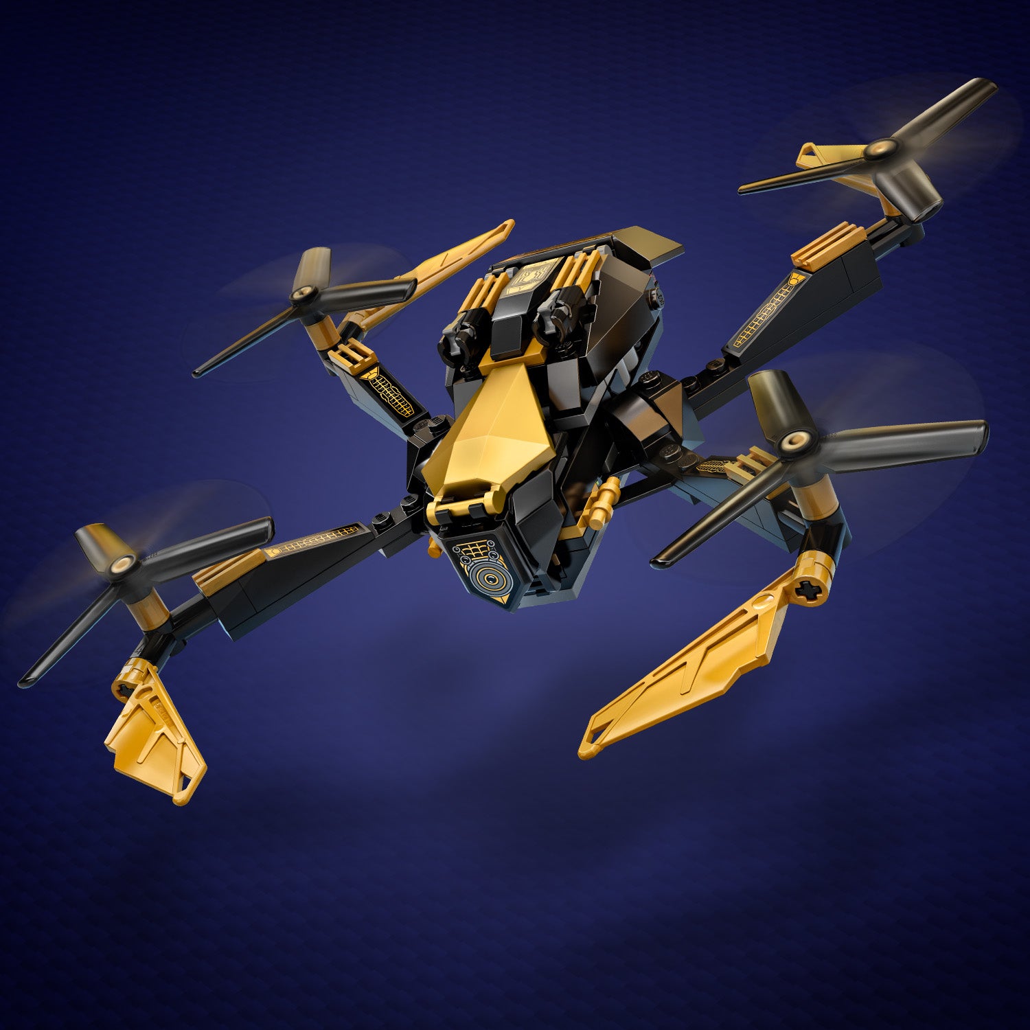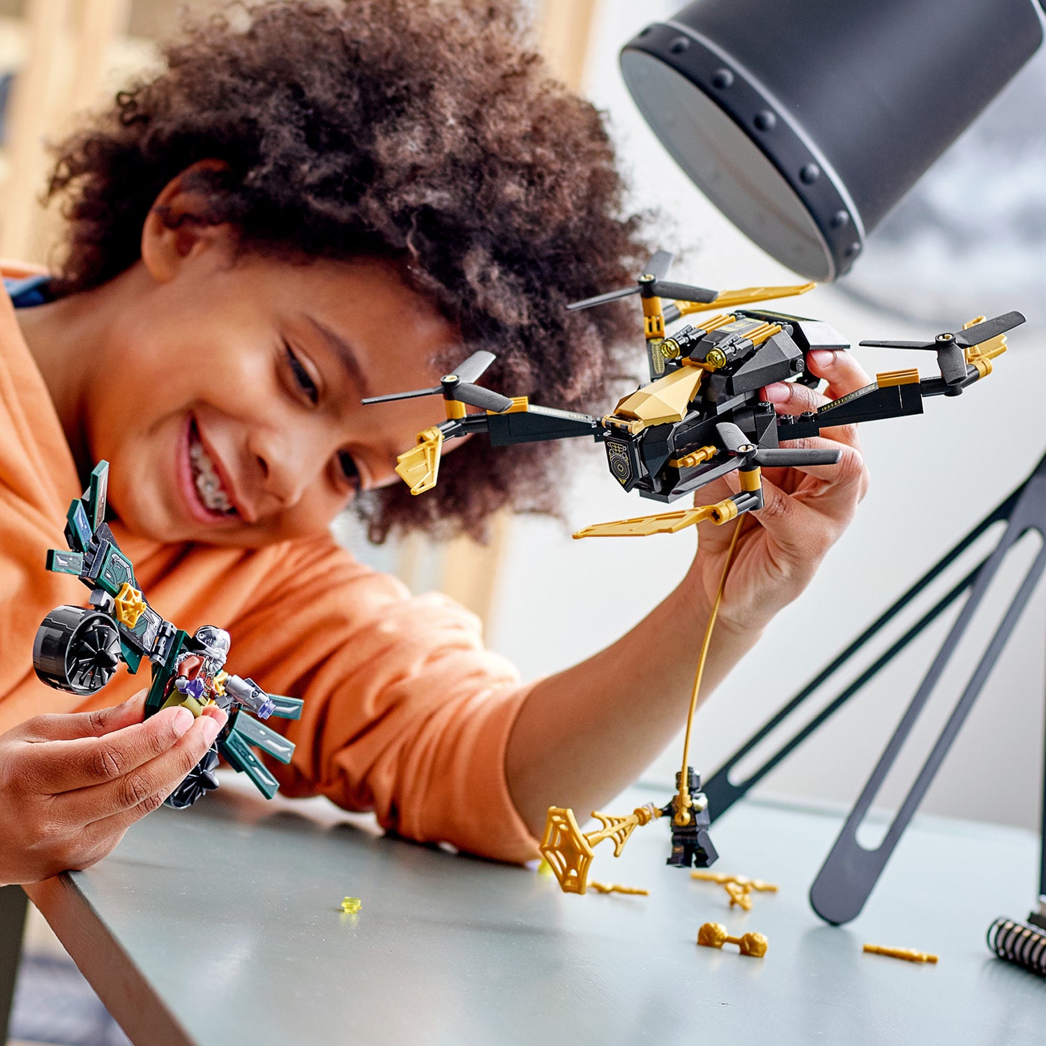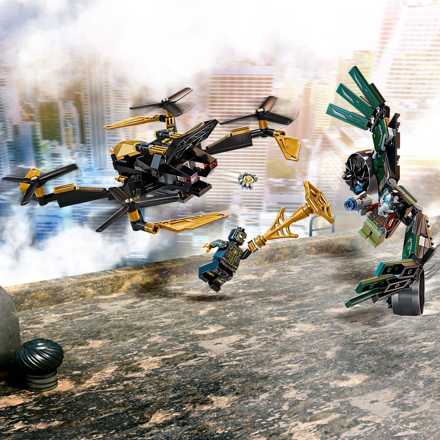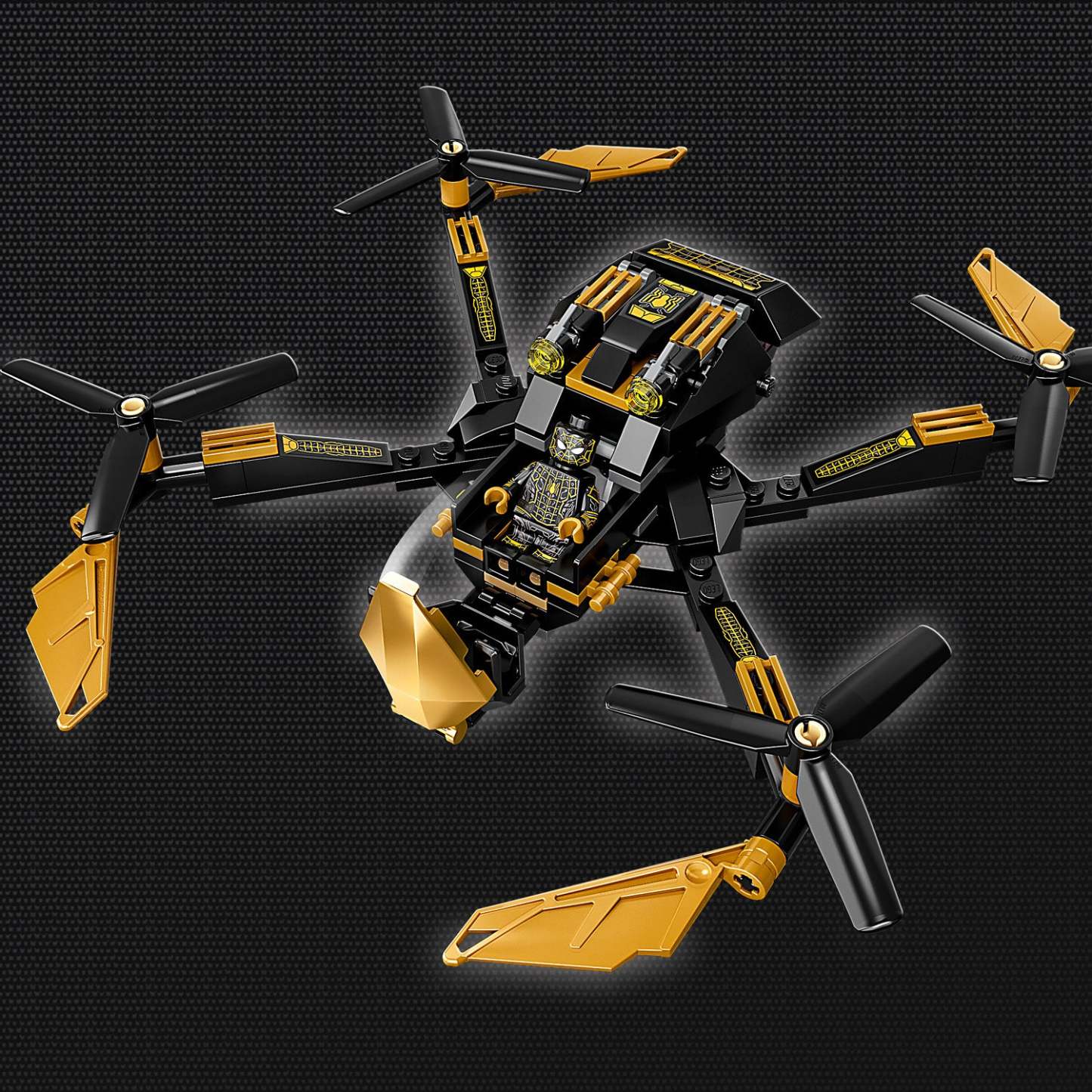 - The drone measures over 2 in. (5 cm) high, 9 in. (23 cm) long and 9.5 in. (25 cm) wide. This versatile playset integrates easily with other LEGO® Marvel building kits.