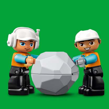 - Includes 2 contemporary construction-worker figures, a push-along truck with a tip function, a push-along excavator with a rotating digger, and a toy boulder that kids can open up.